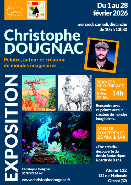 Venez découvrir mon exposition de créatures, je serai en dédicace les dimanches après-midi du mois de février à l'atelier 122 de Gimont entouré de mes œuvres. Un atelier "être créatif" est prévu le mercredi 25 février 2026 de 14 h jusqu'à 16 h, à partir de 10 ans, débutants et adultes acceptés.