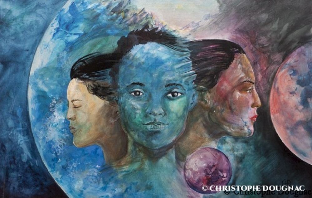 Peinture acrylique représentant les trois visages allégoriques des telluriques, Mercure, Terre et Vénus