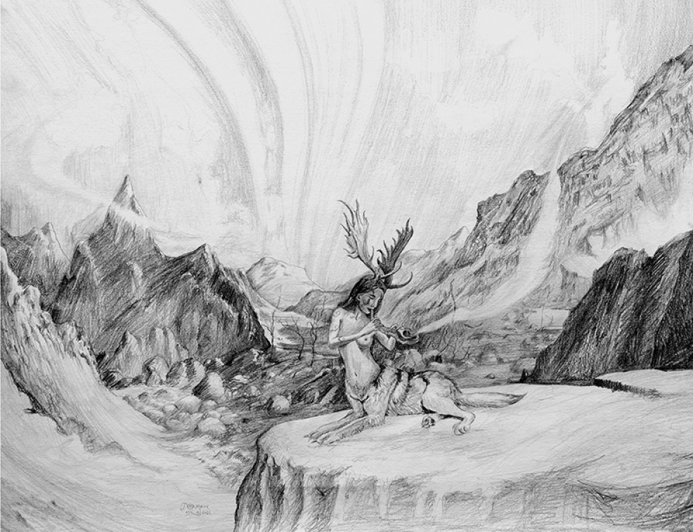 Ce dessin extrait d'une page intérieure des contes fantastiques : " les Essentiels" illustrent les musiciennes sortent de louves qui apaisent par leur mélodie.