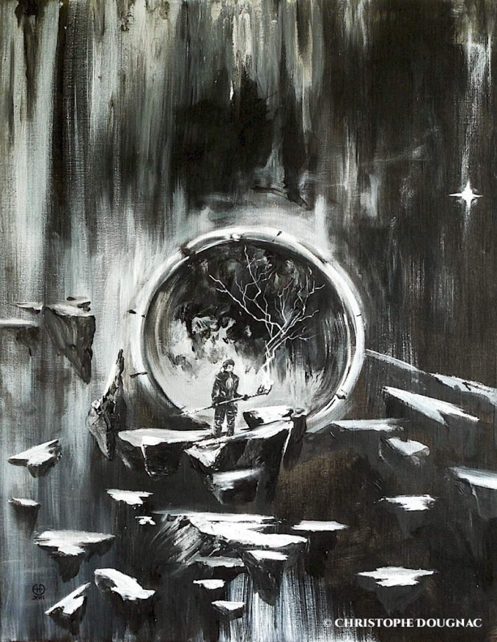 Tableau noir et blanc à l'acrylique. Le pionnier est un des personnages du roman graphique songeurs de monde et il apparait sur la quatrièeme de couverture du livret Planètes Humanoïdes.